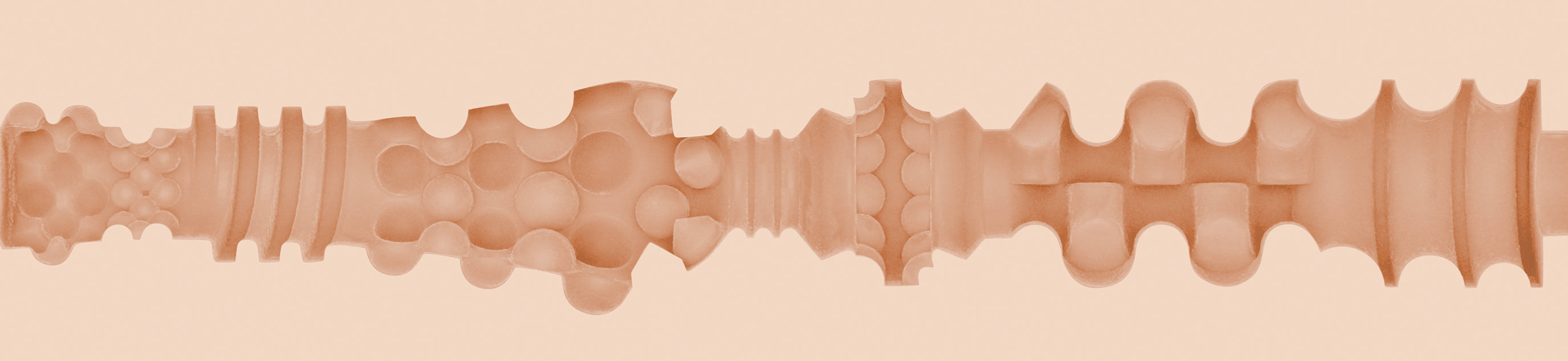 Upon entry, three small rings of bumps will grasp you tightly, followed by the ultra piercing pleasure dome that will give you 360 degrees of unmatched bliss. The next chamber starts with a small row of teeth and fangs that delightfully rub and pull at you. Finally, one row of large bumps leads into a super ribbed texture that narrows the farther you get inside.